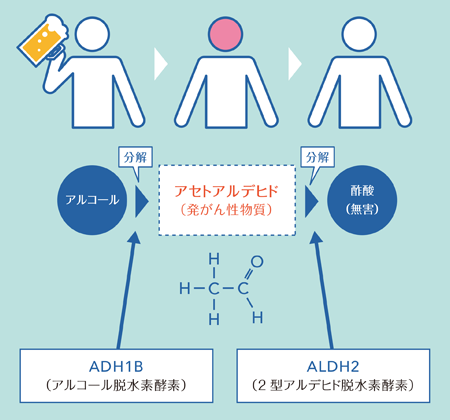 アルコールを代謝する酵素の遺伝子にはいくつかのタイプ(遺伝子多型)があることが分かっています。