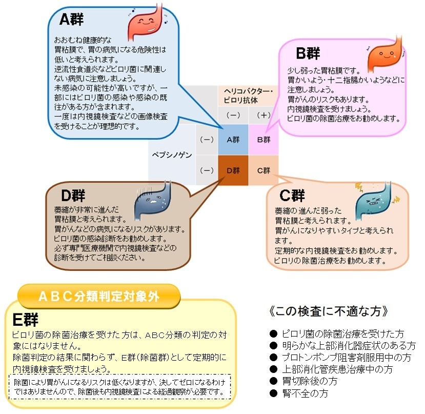 胃粘膜萎縮マーカーのペプシノゲン検査と、胃潰瘍・十二指腸潰瘍・胃がんの主な原因と考えられているヘリコバクター・ピロリの抗体検査を組み合わせて、胃の健康度をA,B,C,Dで分類するのがABC分類です。胃の健康度に応じて内視鏡検査による精密検査を行う等、効率的に検診を行う方法です。
