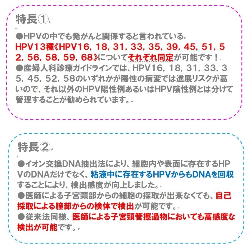 HPVサーティーン(HPV13)検査は、数あるHPVの中でも特に子宮頸がんの発症関係する13種類のハイリスク型HPVを、自己採取検体においても高感度に検出できるため、健診におけるHPV検査の受診率向上が期待できます。