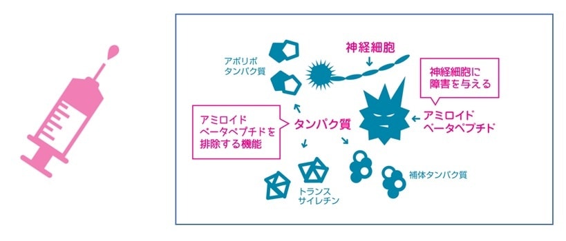アルツハイマー病はアミロイドベータペプチドが脳内に蓄積されて神経細胞がダメージを受けることで発症します。本検査では、このアミロイドベータペプチドを排除する機能を持った3つのタンパク質の血中濃度を調べることでアミロイドベータペプチドへの「防御力」を算定し、間接的に認知症のリスクを予測しております。