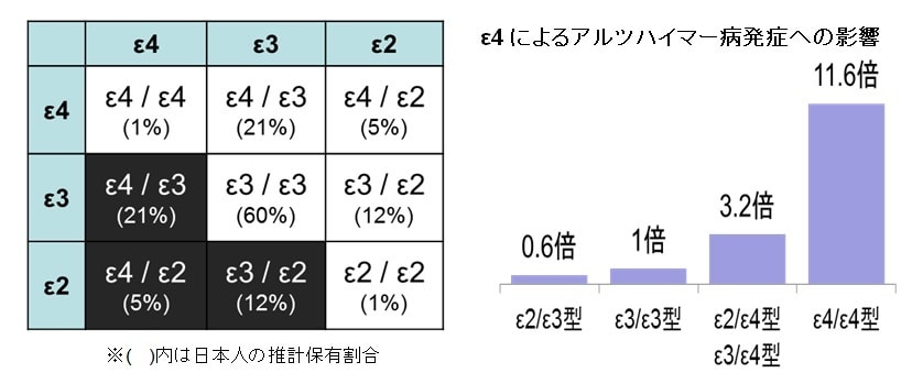 ε4型の遺伝子型を有している方ではε4型ではない方に比べて3~12倍程度のアルツハイマー型認知症のリスクがあることが報告されております。もちろん、アルツハイマー病の発症は「遺伝的要因」だけで決まるものではありませんが、リスクを事前に知り、食事や運動習慣など「環境要因」を意識した生活習慣を行うことで予防が可能になります。