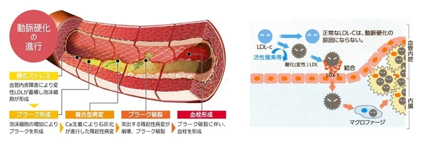 従来よりアテローム性動脈硬化の進展には脂質異常症が関与されているとされていましたが、LDLが血管内に入り込むメカニズムは十分に解明されていませんでした。しかし、沢村博士らの研究によって、酸化(変性)LDLがLOX-1という受容体を介して血管内皮障害を引き起こすことで血管内皮に取り込まれやすくなるというメカニズムが解明され、動脈硬化の発生・進展を早期の段階から捉えることが可能になってきました。