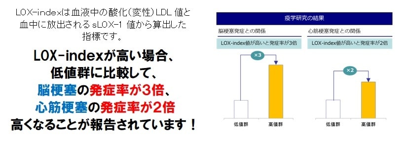 LOX-indexはNKメディコが提供するバイオマーカーで、LOX-1は、国立循環器病研究センターの沢村博士らが発見した酸化(変性)LDLの受容体です。
